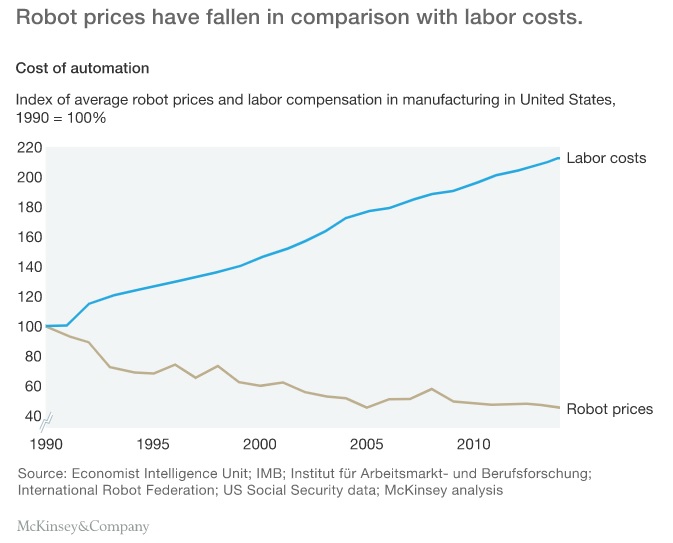 Segundo uma pesquisa realizada pela empresa americana McKinsey & Company, o preço médio dos robôs diminuiu em relação aos custos trabalhistas nas últimas décadas.